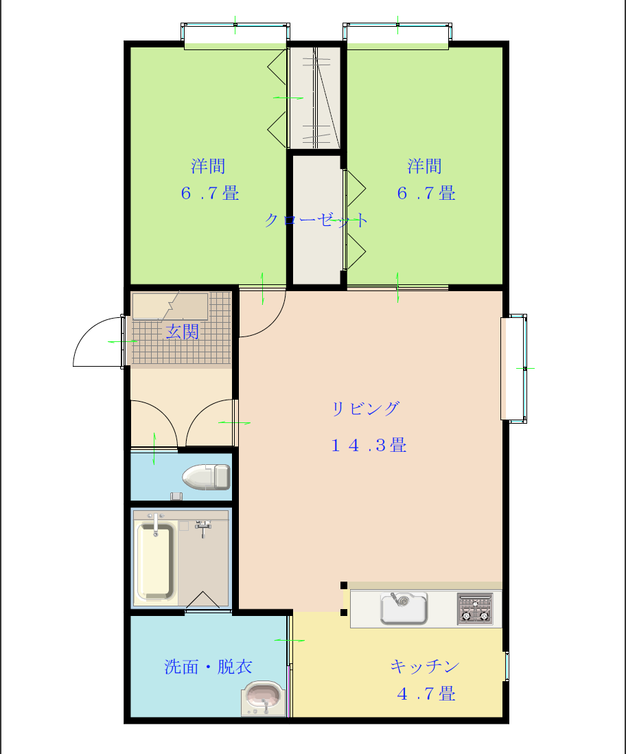 | 2D162 | 60,000円 | なし | 2LDK(14.3畳&6.7畳&6.7畳) | あり | 101 | 1台無料 |
